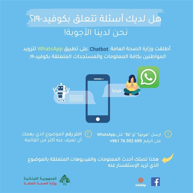 أطلقت وزارة الصحة العامة اليوم خدمة رسائلها المخصصة باللغتين العربية والإنكليزية، بالشراكة مع شركتي واتساب وفيسبوك عبر منصة الاتصالات العالمية لشركة انفوبب ، لإطلاع الجمهور على آخر المستجدات المتعلقة بفيروس كورونا.