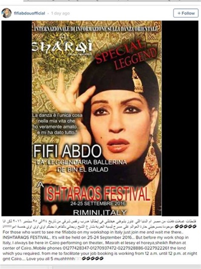 وقالت "عبده" معلقة على الصورة: "قشطات عسلات فلات من مصر أم الدنيا اللي عاوز يشوفني هيقابلني في إيطاليا هدرب رقص شرقي من تاريخ ٢٤ الي ٢٥ سبتمبر ٢٠١٦، لكن أنا موجودة بمسرحيتي حارة العوالم على مسرح ليسية الحرية بشارع الشيخ ريحاني بالقاهرة بحبكم أوي خمسة امواة"، وعلق حساب يحمل اسم "رنا حسين" قائلًا: "إنترناشونال فيفي"، وكذلك حساب يحمل اسم "فريدة علي": "فضائح الإنترناشونال".